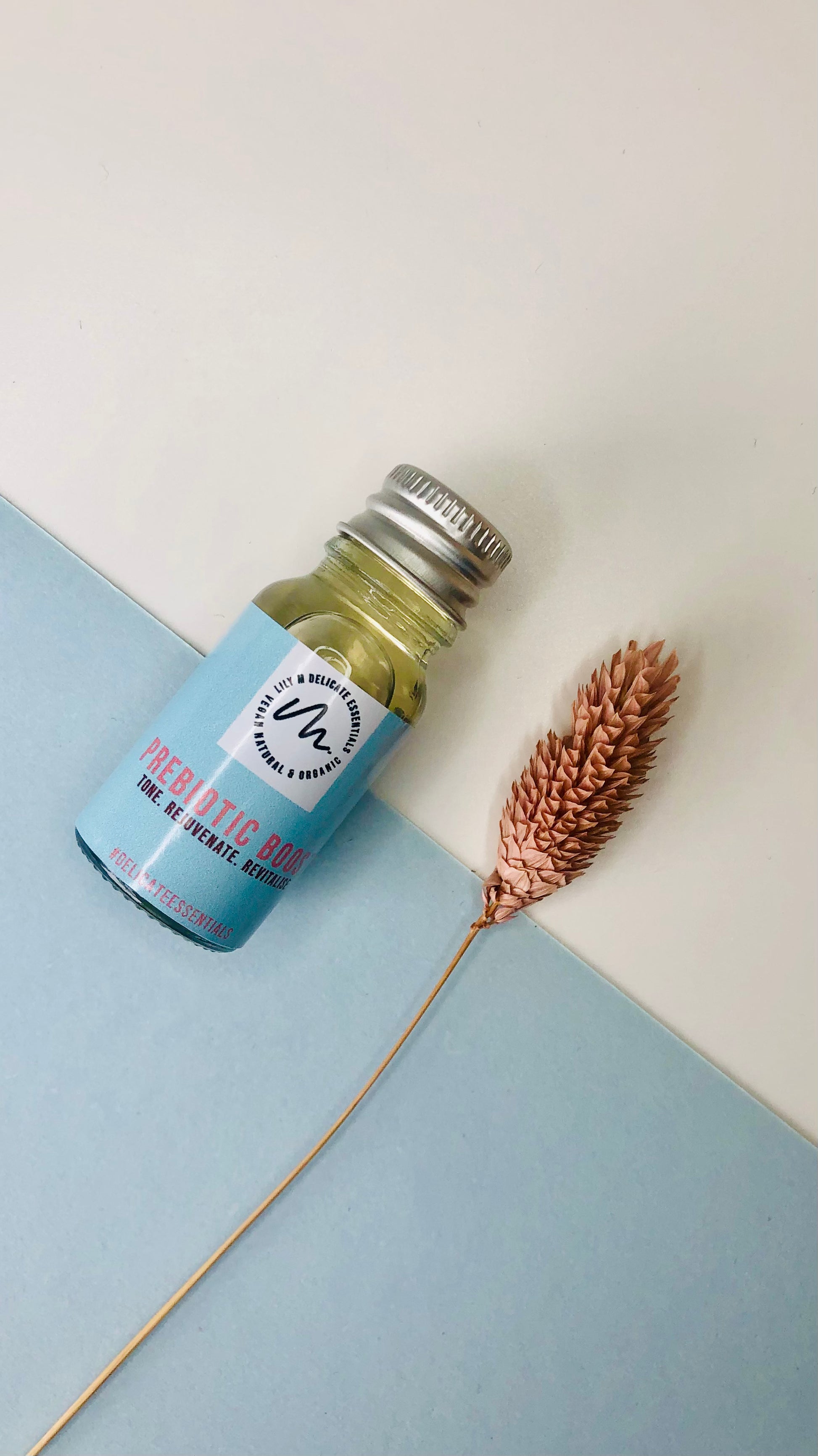 Prebiotic Boost - Ingredients: Citrus Aurautium Amara flower water*, Anthemis Nobilis*, Hamamelis virginiana leaf (Witch Hazel) water*, Aloe Barbadensis Leaf Juice*, Citric Acid, Potassium Sorbate, Sodium Benzoate, Naicinamide, Aqua, alpa-glucan, oligossacchoride, Benzyl Alcohol & Salicylic Acid & Glycerin & Sorbic Acid *Organic Ingredients
