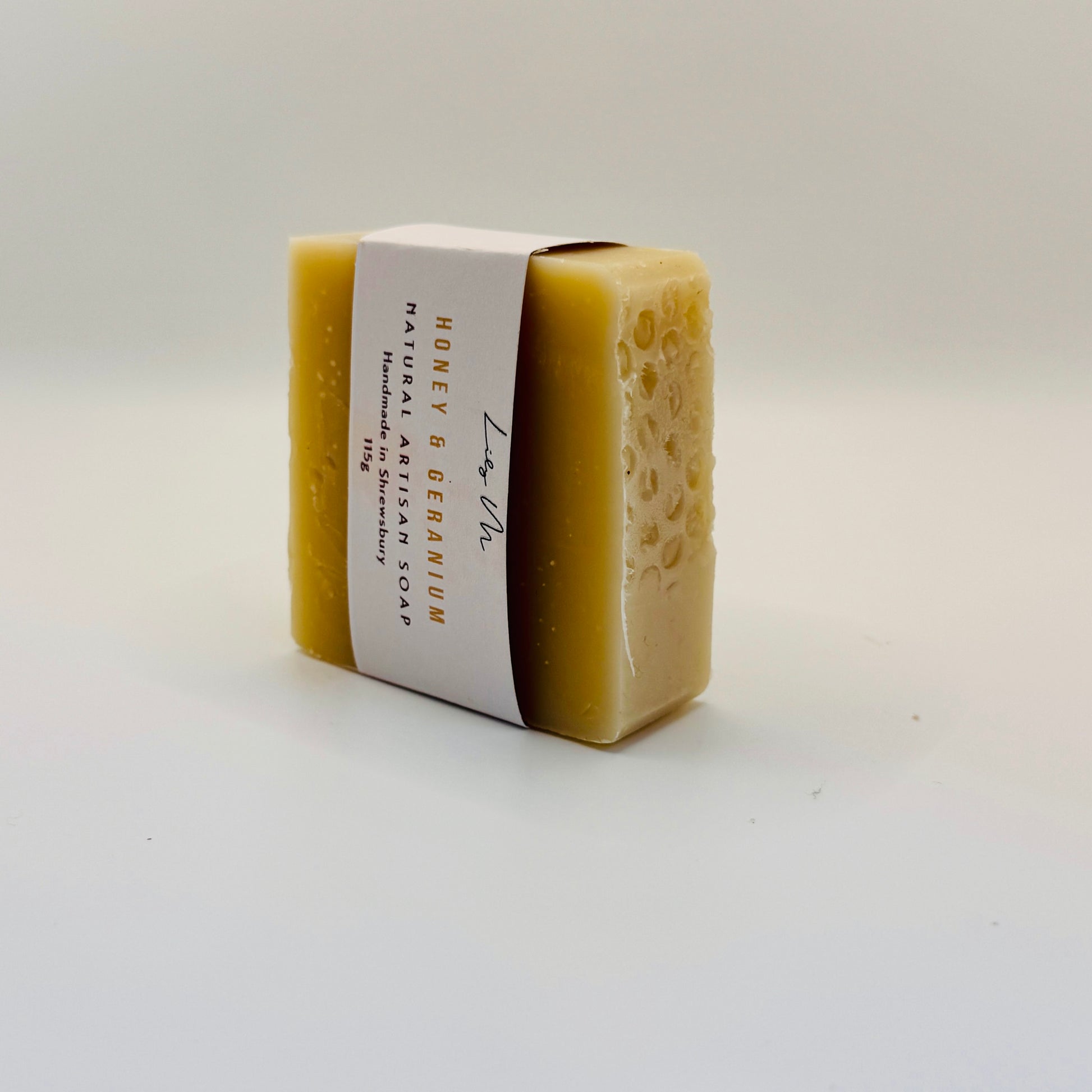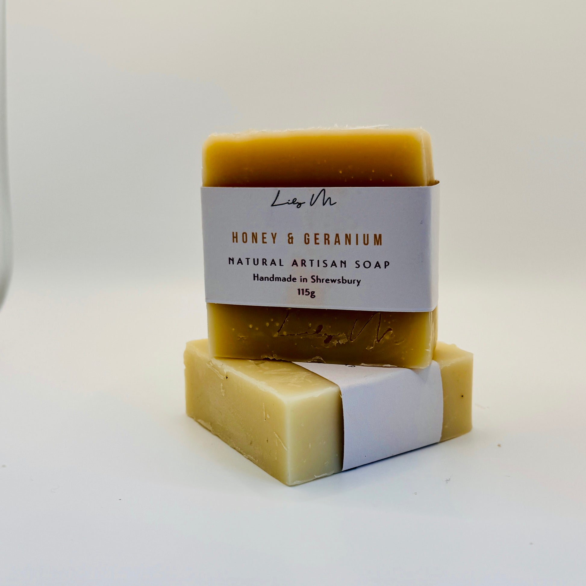 This bar contains a blend of Honey and Geranium that can assist in soothing the skin, promoting skin wellness, and achieving a natural glow.