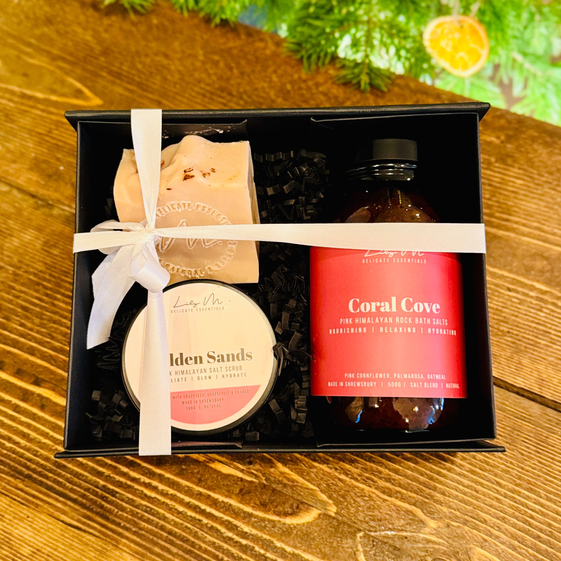 Perfect for pink lovers. This gift box includes our Rose & Lime Medium Soap Bar in pink, Golden Sands Himalayan Salt Body Scrub for exfoliation, and Coral Cove Bath Salts with Himalayan minerals. Everything you need to cleanse, invigorate, and unwind in style.