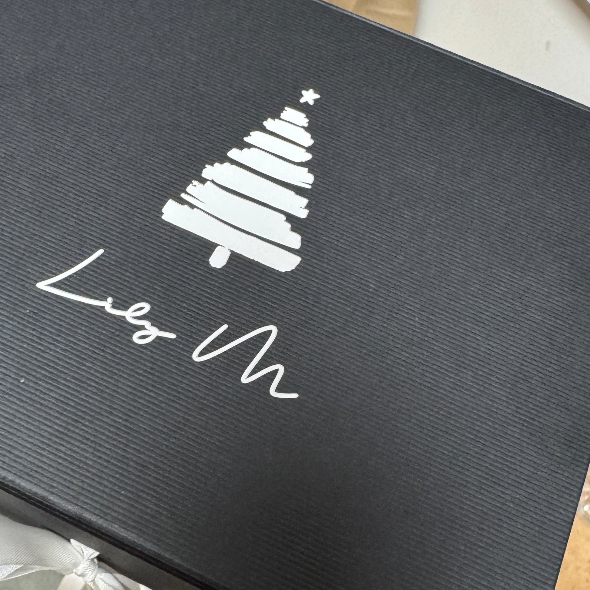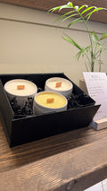 Candle trio gift box with Three different festive essentials oil blends finished off with eco Shea wax, a wooden wick in a handmade ceramic jar